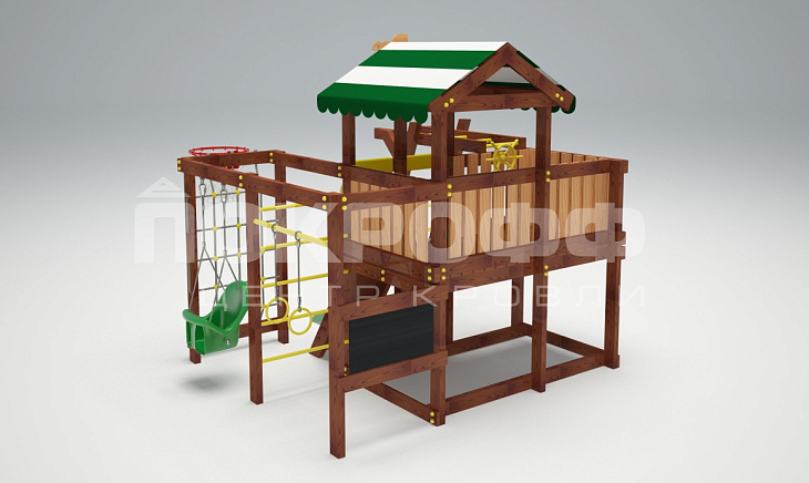 Платформа домика высотой 90 см с балконом соединена со спортивно-развлекательной частью. Подняться в домик можно по скалодрому с канатом. Металлические перекладины рукохода, шведской стенки и турника имеют порошковое покрытие. Оно хорошо держится на металле.