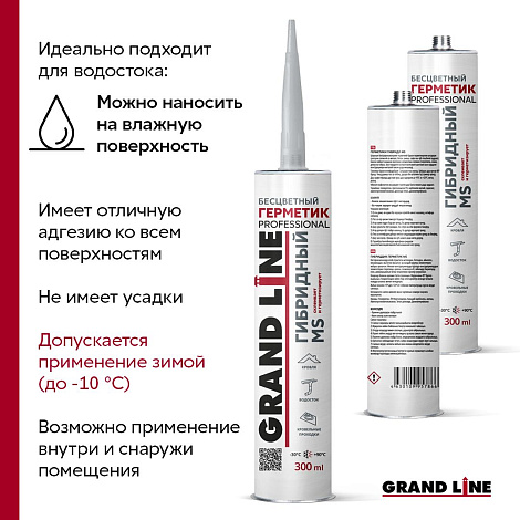 Герметик Grand Line Professional гибридный MS — универсальный клей-герметик, идеален для водосточных систем. Можно наносить на влажную поверхность, не дает усадку, подходит для внутренних и наружных работ.